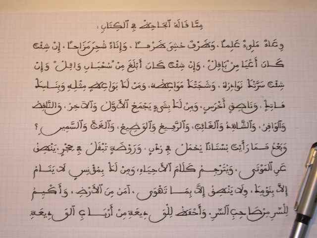昨日は やっとやる気になった(腰重すぎっ!)アラビック・カリグラフィのコンテスト用 下書きを書く。マグリビー書体というので 挑戦するんだけど、この書体は 3母音の発音記号(シャクル)を文字にふっていかないとダメなものなの。・・・がしかし 課題のアラビア語にはシャクルがふっていないという ネイティブじゃない人間にはかなりハンデが・・・^_^; イラク人のアラビア語の先生に一応見てもらったけど、文章が本からの一部抜粋らしく確信が持てないそうダ。