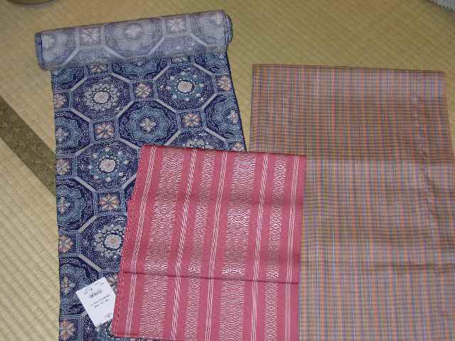 左にあるのが今日買った反物&帯 その隣のは 今縫ってる会津紅花染めの紬。今日の帯は これにも合いそう♪